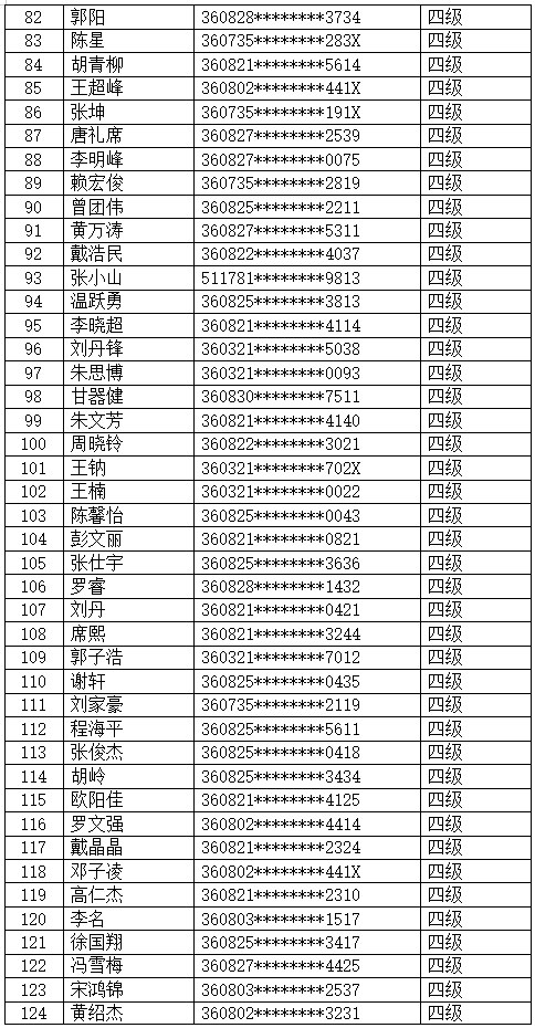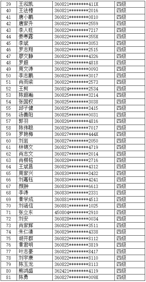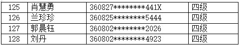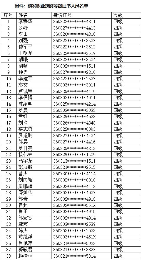 根據《江西省人力資源和社會保障廳關于遴選備案職業技能等級認定社會培訓評價組織的通知》(贛人社字(2020)302號)、(贛人社字(2022)128號)文件要求。按照《關于開展“互聯網+職業技能等級認定”試點工作的通知》(贛人社字(2020)397號)精神。我校于2024年11月25日開展了計算機及外部設備裝配調試員(計算機整機裝配調試員)等級認定,共140人(四級),通過認定考核128人。現對認定考核合格人員進行公示(名單附后)。