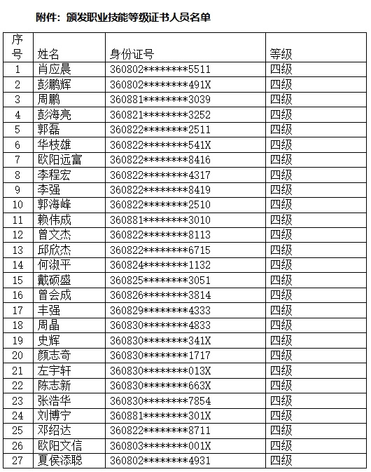 根據《江西省人力資源和社會保障廳關于遴選備案職業技能等級認定社會培訓評價組織的通知》(贛人社字(2020)302號)、(贛人社字(2022)128號)文件要求。按照《關于開展“互聯網+職業技能等級認定”試點工作的通知》(贛人社字(2020)397號)精神。我校于2024年12月10日-11日開展了汽車維修工(汽車維修檢驗工)等級認定,共27人(四級),通過認定考核27人。現對認定考核合格人員進行公示(名單附后)。