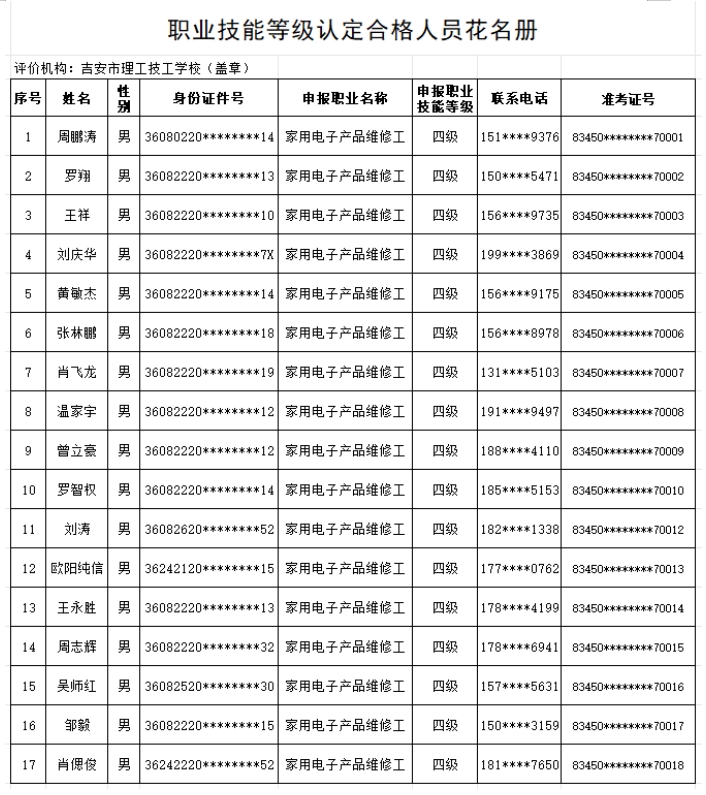 按照《贛人社規(guī)【2022】7號(hào)》文件精神。我校于2025年3月27日開展了家用電子產(chǎn)品維修工等級(jí)認(rèn)定,共18人(四級(jí)),通過認(rèn)定考核17人。現(xiàn)對認(rèn)定考核合格人員進(jìn)行公示。(名單附后)