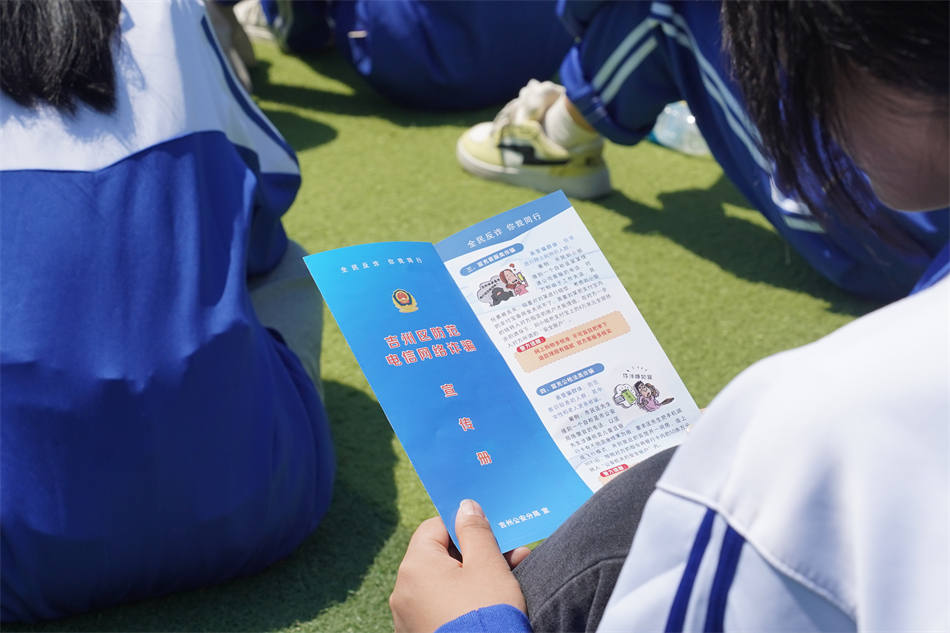 宣講間隙,民警們穿梭人群,將一份份圖文并茂的防詐宣傳單遞到學生手中。宣傳單上,各類詐騙方式用醒目標題標注,配合漫畫解析詐騙場景,成為同學們手中的“防詐指南”。