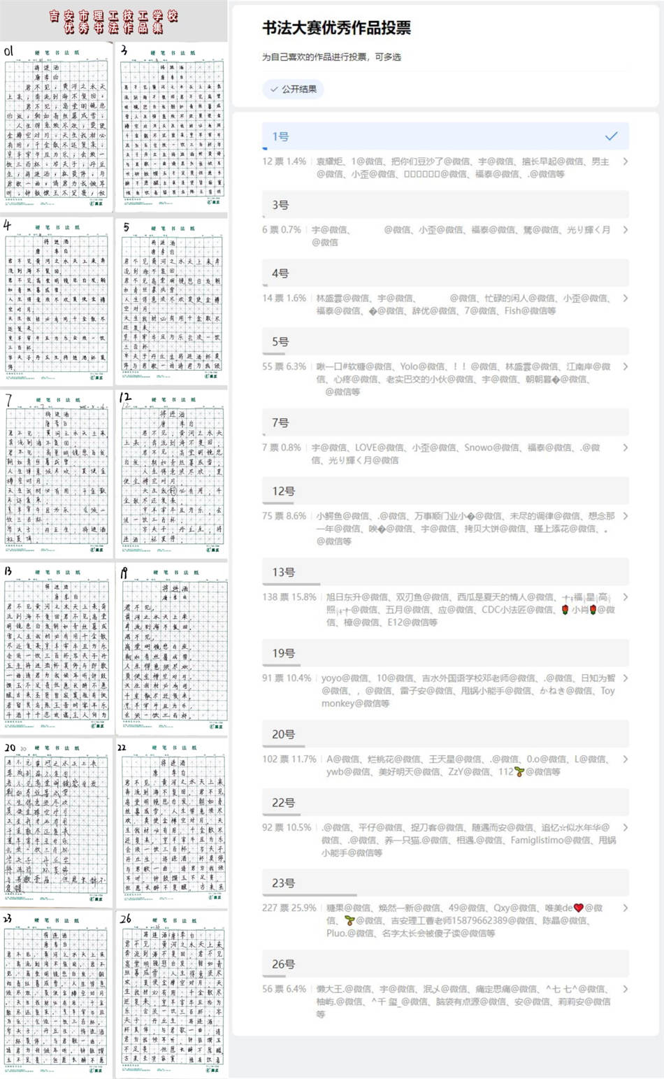 本次大賽評審團由公共課教研組多位教師組成,他們從筆法結(jié)構(gòu)、章法布局、創(chuàng)意表達等多個維度對作品進行綜合評判,幾位評審在點評中高度贊揚了同學(xué)們的表現(xiàn),他們表示:“硬筆書法不僅是技藝的磨礪,更是心性的修煉。”賽事還另辟“云端擂臺”,通過學(xué)校官方平臺進行作品展示,經(jīng)專業(yè)評審與大眾投票的雙重考量,最終評選出一、二、三等獎及網(wǎng)絡(luò)投票最受歡迎獎。