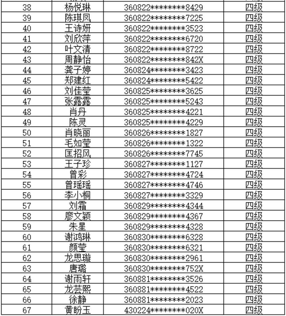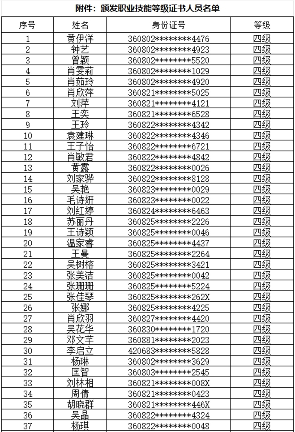 根據《江西省人力資源和社會保障廳關于遴選備案職業技能等級認定社會培訓評價組織的通知》(贛人社字(2020)302號)、《江西省人力資源和社會保障廳關于公布江西省第二批職業技能等級認定社會培訓評價組織的通知》(贛人社字(2022)128號)文件要求。按照《關于開展“互聯網+職業技能等級認定”試點工作的通知》(贛人社字(2020)397號)精神。我校于2024年10月31日開展了養老護理員等級認定,共70人(四級),通過認定考核67人。現對認定考核合格人員進行公示(名單附后)。