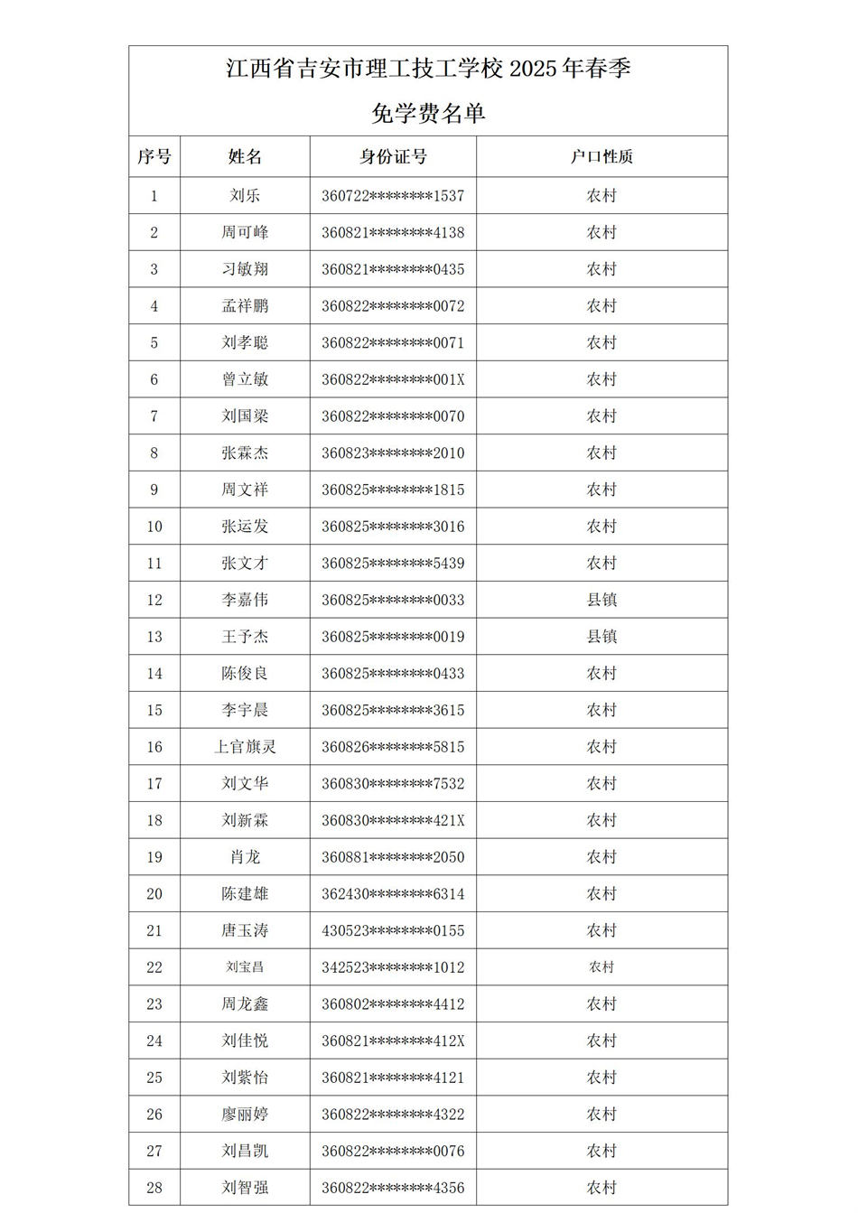2025年春季學期我校22級學生免學費申報360人,23級免學費申報219人,24級免學費403人,具體申報名單見以下,公示日期為4月2日至4月12日。如有疑問請于公示日期內向校紀檢監察室或省人力資源和社會保障廳職業能力建設處反映。