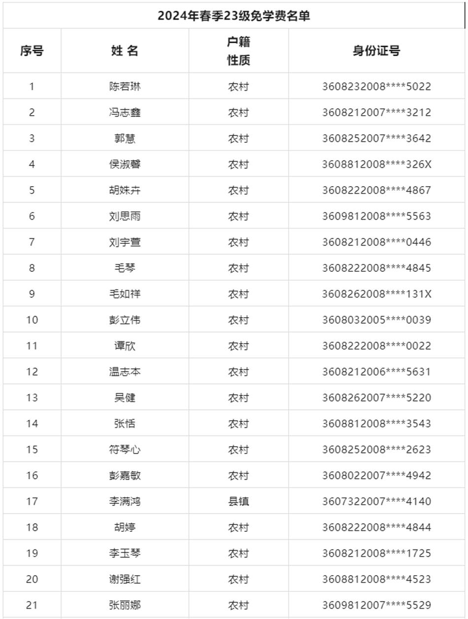 2024年春季學期我校21級學生免學費申報526人,22級免學費申報394人,23級免學費293人,22級助學金143人,23級助學金90人,具體申報名單見以下,公示日期為4月2日至4月12日。如有疑問請于公示日期內向校紀檢監察室或省人力資源和社會保障廳職業能力建設處反映。